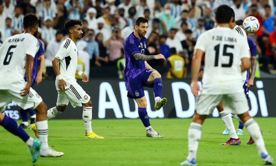 El astro rosarino probó desde el borde del área grande y la pelota se fue a centímetros del travesaño. El arquero Khalid Eisa nunca hubiera tenido opción de llegar al balón.