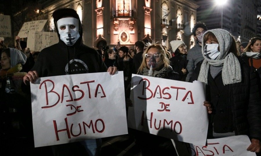 La frase “Plomo y humo” también está presente en otros carteles esta noche. Se funde con el pedido de una ley de humedales. Son casi las ocho y Piripincho arranca una ovación alegre entre los que siguen el debate, al pie del mástil mayor y de cara al Parque a la Bandera.