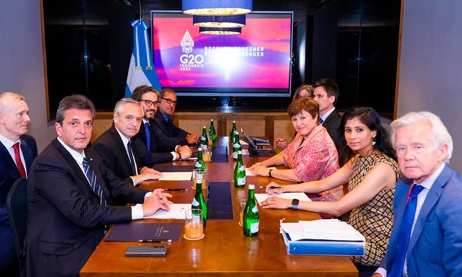 Durante la reunión, que se desarrolló en el salón Tampaksiring de la planta baja del hotel Meliá, el Presidente planteó una revisión de las metas acordadas con el organismo de crédito para el tercer y cuarto trimestre del año. Además, insistió con la reducción de las sobretasas que cobra el organismo y solicitó que se compensen los costos de la Guerra en Ucrania.