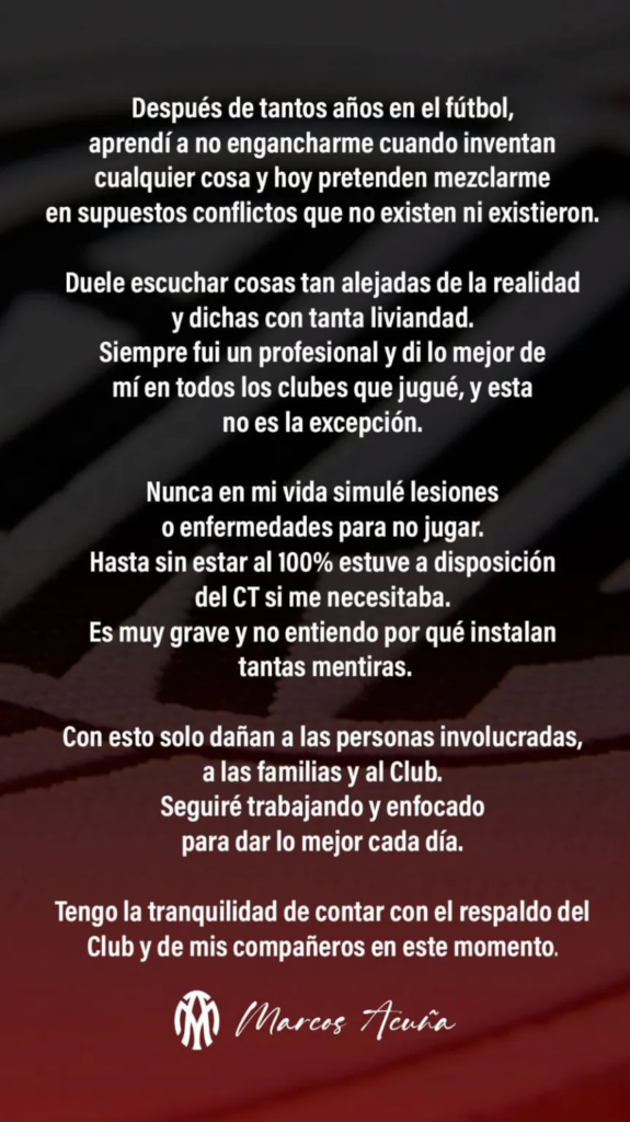 Tras el encuentro, comenzaron a circular versiones que atribuían la salida del entrenador a presuntos conflictos internos con algunos referentes del plantel. Entre los nombres mencionados apareció el de Marcos Acuña, quien fue señalado en distintos comentarios y publicaciones.