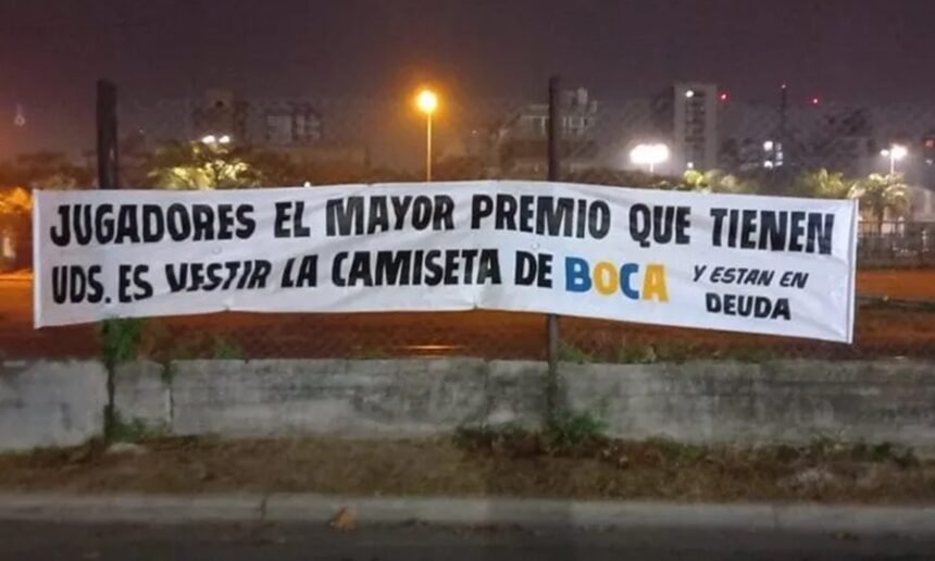 Pasadas las dos y media de la madrugada, se vio colgada la bandera en una reja en las adyacencias del estadio. “Jugadores, el mayor premio que tienen ustedes es vestir la camiseta de Boca. Y están en deuda”, se lee en letras grandes.