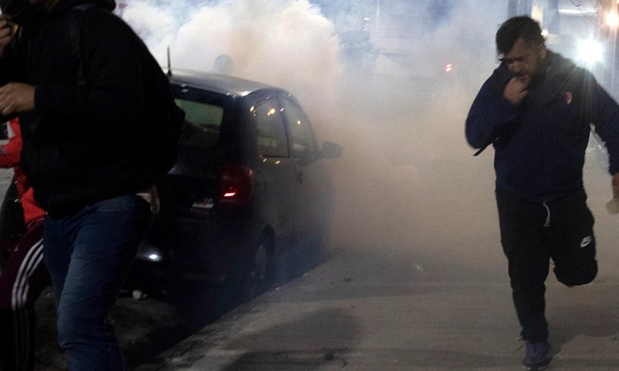 La Policía cortó el acceso de la calle Montes de Oca para evitar que los hinchas se movilizaran hacia la salida del gimnasio Bottaro, desde donde salieron los asambleístas. Contra ese cordón dispararon a los manifestantes, que se mantuvieron en su mayoría sobre la avenida Mitre, en algunos casos protegidos por los contenedores de basura.