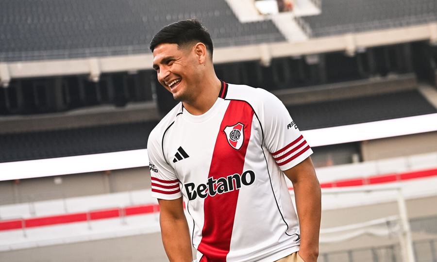 El zurdo de 27 años pasó por el Monumental a firmar su vínculo hasta fines de 2029 y posó con la camiseta de River para las fotos oficiales.