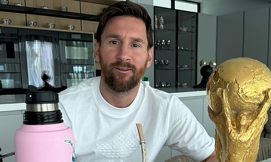 La Pulga compartió dos fotos en sus redes sociales. En una de ellas, se lo ve con su mate y termo con los colores del Inter Miami, junto al Trofeo de la Copa del Mundo. En la otra imagen, aparece cebando un mate, en un gesto íntimo que conecta lo cotidiano con el orgullo de aquel logro histórico.