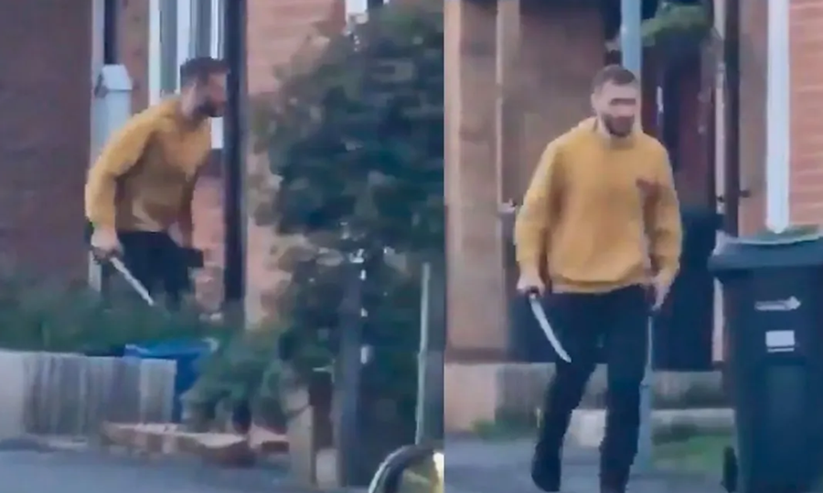 Imágenes divulgadas en las redes sociales y recogidas por los medios británicos mostraban a un hombre blanco, con pantalones negros y una sudadera amarilla con capucha, espada en mano, caminando erráticamente frente a las casas, mientras los coches de policía rodeaban la escena.
