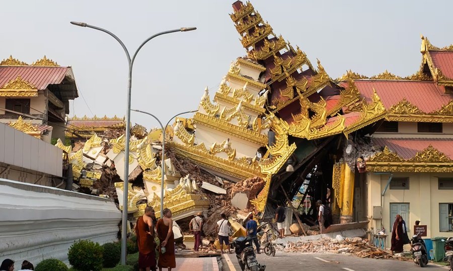 En Mandalay, una de las ciudades más importantes de Birmania, con más de 1 millón 700 habitantes, se reportó el desplome de una pagoda de varios siglos. Esta quedó resumida a escombros.