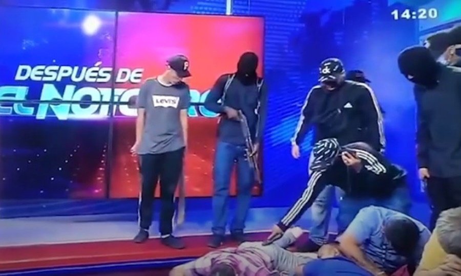 La transmisión en vivo muestra a los periodistas y trabajadores del medio amenazados con armas y explosivos.