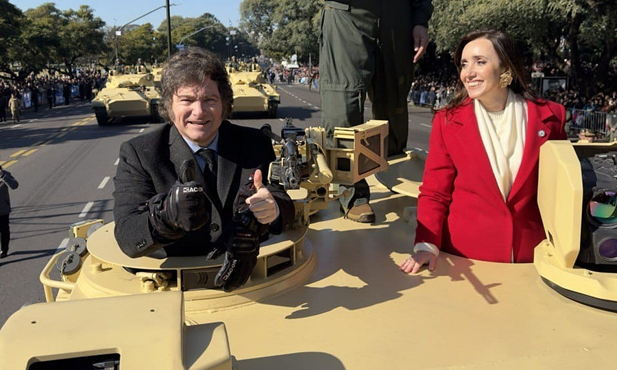 La imagen de Milei y Villarruel juntos al frente de un vehículo de combate se produjo horas después de que la vicepresidenta se ausentara -adujo un estado gripal- del acto que se realizó en Tucumán, para rubricar el denominado “Pacto de Mayo”.