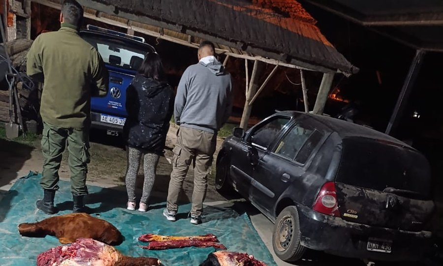 Efectivos de la Guardia Rural Los Pumas de Sección Nº14 recibieron llamado telefónico, por parte de personal Sub Cría. 3ra de Colonia teresa, quien solicito la presencia de esta preventora en el lugar, por tener un vehículo retenido con bultos semejantes a carne vacuna de dudosa procedencia en su interior, como así también, a dos personas en estado de aprehensión. Constituidos en ruta N° 1, altura Colonia Yatay, realizaron un despliegue en las inmediaciones del lugar y lograron dar con dos sujetos mayores de edad, procedieron a la aprehensión delos mismos. Secuestraron preventivamente 350 kilogramos aproximadamente de carne vacuna, dos teléfonos celulares yun automóvilRenault Clío en el que se trasladaban. El secuestro fue trasladado a la Seccional de La guardia Rural Los Pumas junto con los involucrados en calidad de aprehendidos. Lugar donde fueron notificados por ABIGEATO E INFRACCION DEL ART. 206 DEL C.P.A. En estado de Libertad.Se hizo presente en la sede policial el ciudadano, que realizó la denuncia, exponiendo que se dedica a la administración rural y ser dueño del fundo en zona de isla, el cual posee vacunos de su propiedad, y en momentos de la mañana se dirigió al campo, a realizar el recorrido habitual,divisando viseras de un animal faenado. De esta manera procedieron a la constatación de la misma y posterior Informe Veterinario, el cual adujo, que los cortes de carne secuestrados, son de similares características al denunciado, y que no son aptos para consumo, siendo seguidamente desnaturalizado. Interviene Unidad Fiscal de la Ciudad correspondiente.