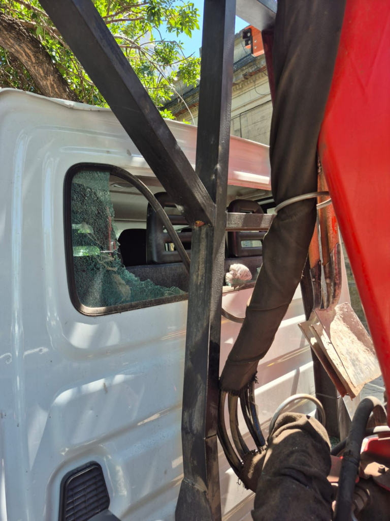 Camión de la EPE con daños visibles tras un violento ataque a piedrazos durante un operativo en barrio Villa del Parque.