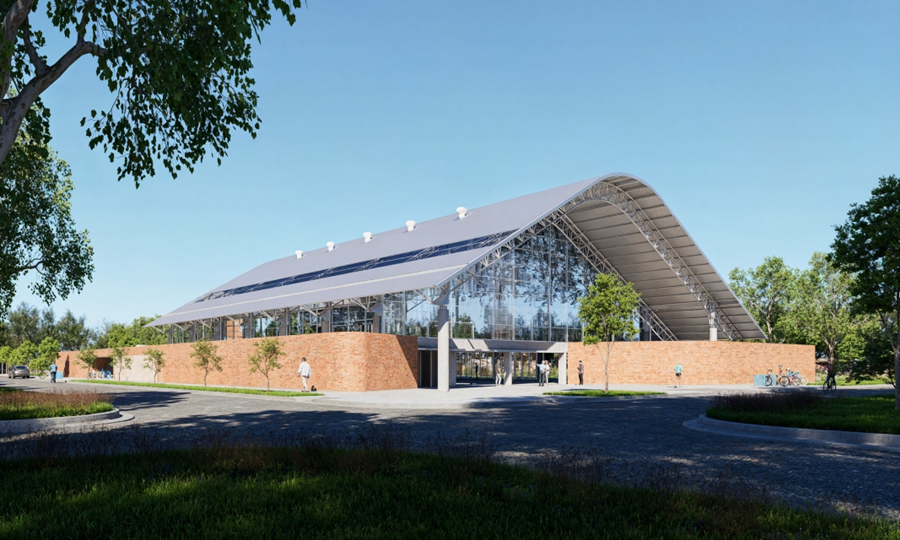 “Se definieron dos estrategias para atenuar el impacto de la masa construida en la relación con el contexto urbano, porque el entorno tiene una densidad edilicia baja. Por un lado, la propuesta se retira de la línea de edificación para generar un ingreso semicubierto jerarquizado. Por otro lado, para reducir el impacto de la altura máxima de la nave, decidimos una cubierta a dos aguas y ubicar hacia el perímetro de contacto con la vereda los volúmenes de menor tamaño que alojan los servicios complementarios”, precisó Pascualón.