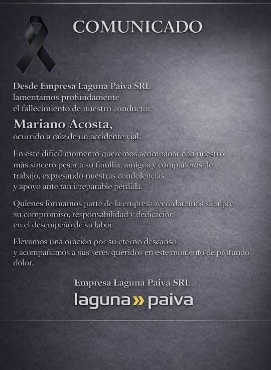 A través de un comunicado oficial, Empresa Laguna Paiva SRL expresó su profundo dolor por la pérdida de su trabajador, destacando su trayectoria dentro de la firma.